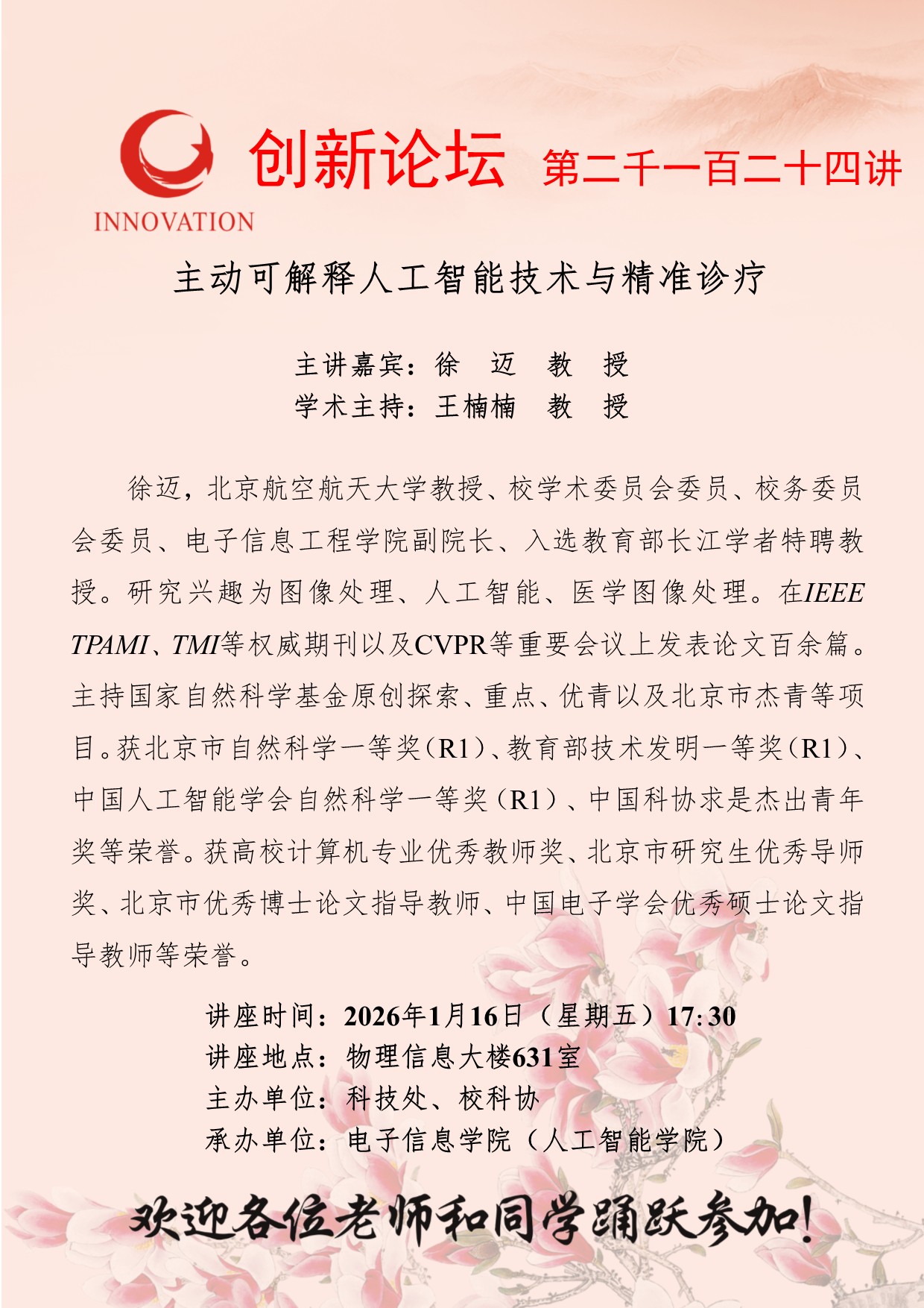 徐迈 教授 伟德国际1946源于英国创新论坛第二千一百二十四讲:主动可解释人工智能技术与精准诊疗 讲座时间 2026年1月16日(星期五)17:30 讲座地点 物理信息大楼631室 讲座人介绍 徐迈 教授 讲座内容