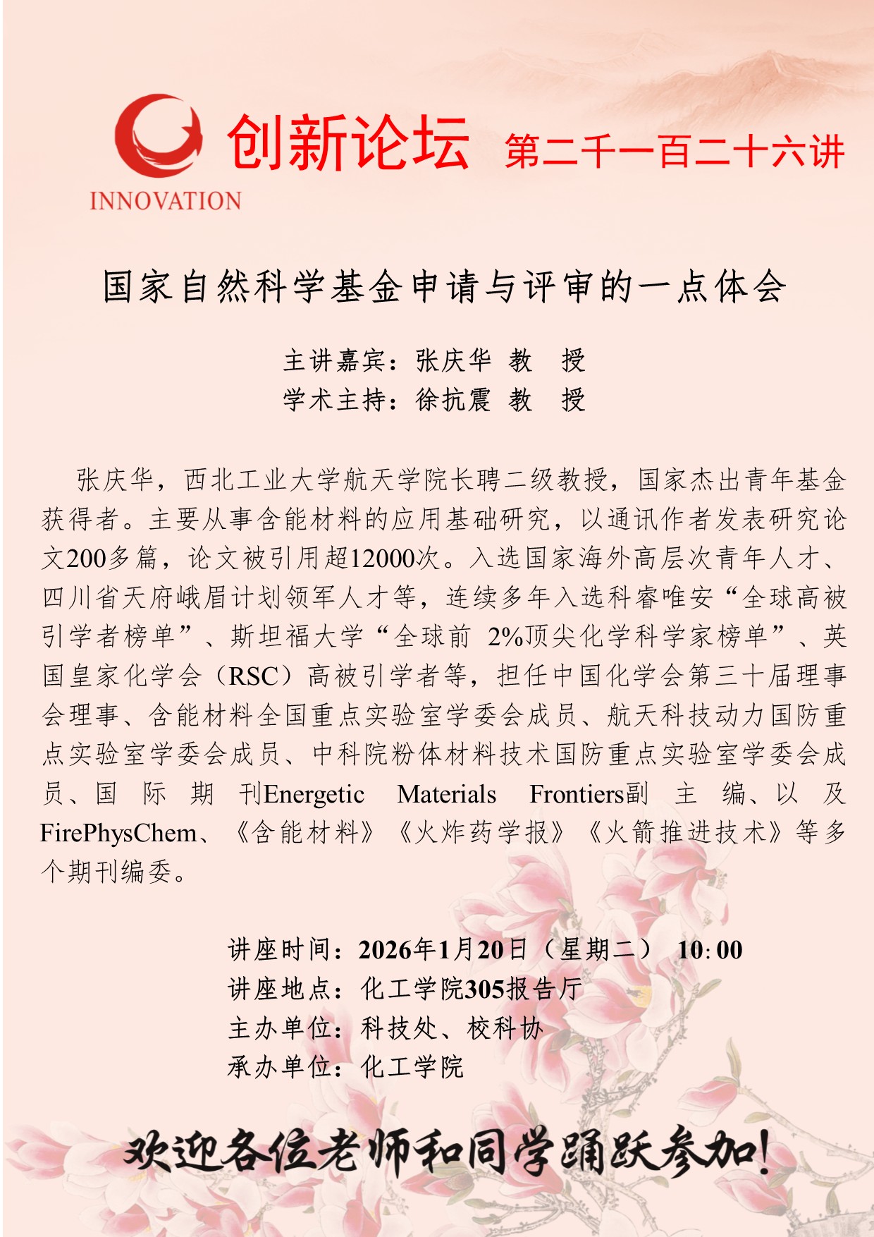 张庆华 教授 伟德国际1946源于英国创新论坛第二千一百二十六讲:国家自然科学基金申请与评审的一点体会 讲座时间 2026年1月20日(星期二) 10:00 讲座地点 化工学院305报告厅 讲座人介绍 张庆华 教授 讲座内容