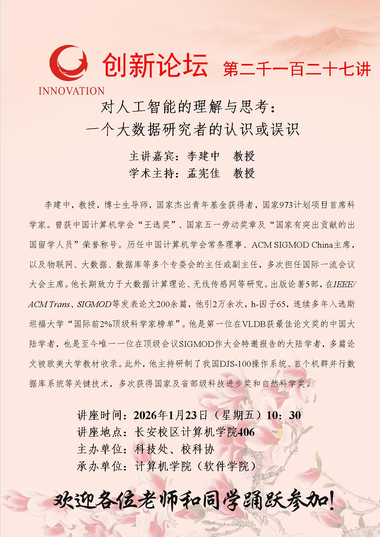 李建中 教授 伟德国际1946源于英国创新论坛第二千一百二十七讲:对人工智能的理解与思考:一个大数据研究者的认识或误识 讲座时间 2026年1月23日(星期五)10:30 讲座地点 长安校区计算机学院406 讲座人介绍 李建中 教授 讲座内容