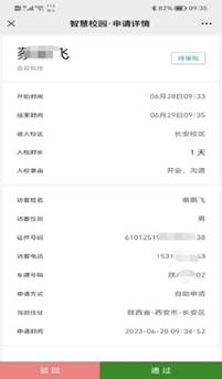教职工收到学校信息中心推送的访客申请后,进入访客申请审批页面,点击驳回或通过,即可完成访客申请。
