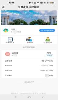 1.进入伟德国际1946源于英国移动校园应用,点击“Y.移动访客”,进入“智慧校园 移动接访”,通过分享申请码或代客申请提交访客申请信息。