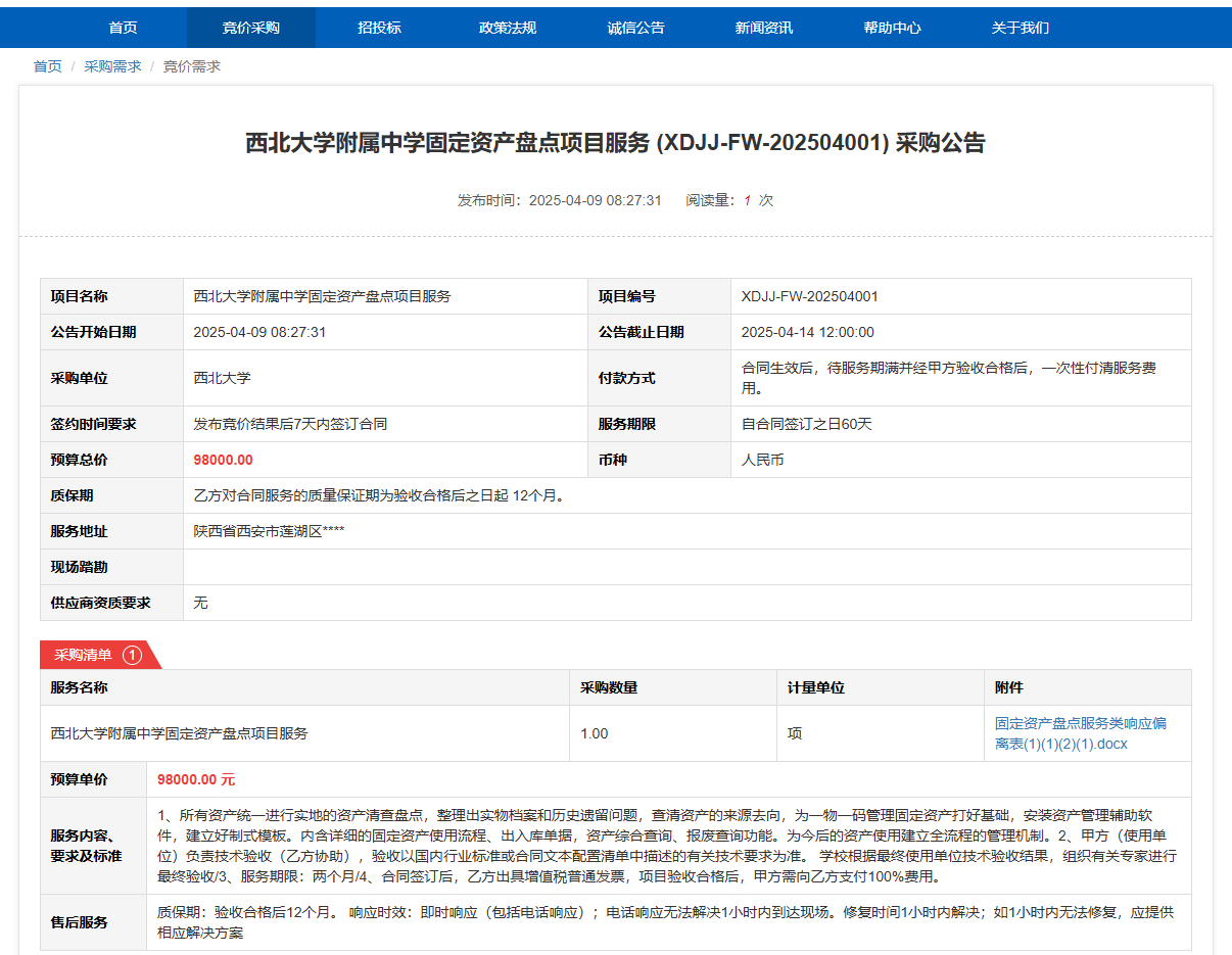 伟德国际1946源于英国附属中学固定资产盘点项目服务(XDJJ-FW-202504001)竞价采购公告 作者:采购与招标办公室 编辑: 时间:2025-04-09 原公告链接:https://www.ejingcai.com.cn/site/bidding/detail/17501