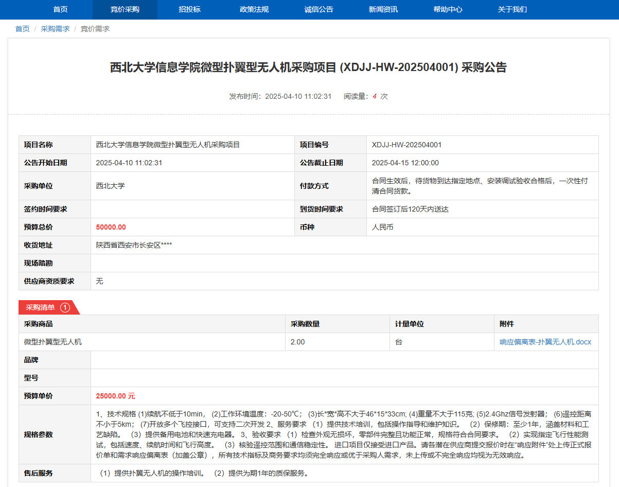伟德国际1946源于英国信息学院微型扑翼型无人机采购项目(XDJJ-HW-202504001)竞价采购公告 作者:采购与招标办公室 编辑: 时间:2025-04-10 原公告链接:https://www.ejingcai.com.cn/site/bidding/detail/17536