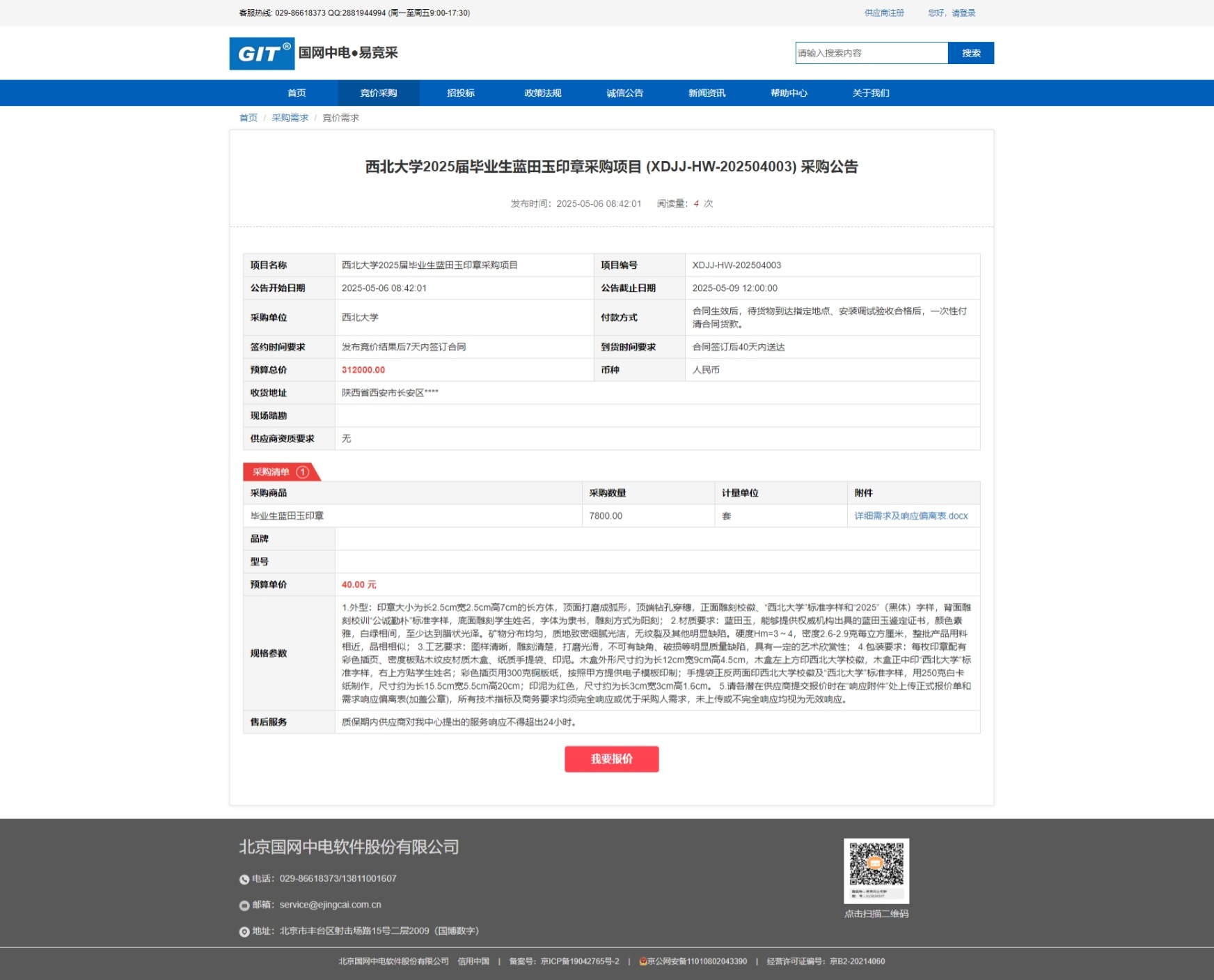 伟德国际1946源于英国2025届毕业生蓝田玉印章采购项目 (XDJJ-HW-202504003) 竞价采购公告 作者: 编辑:采购与招标办公室 时间:2025-05-06 原公告链接:https://www.ejingcai.com.cn/site/bidding/detail/18026