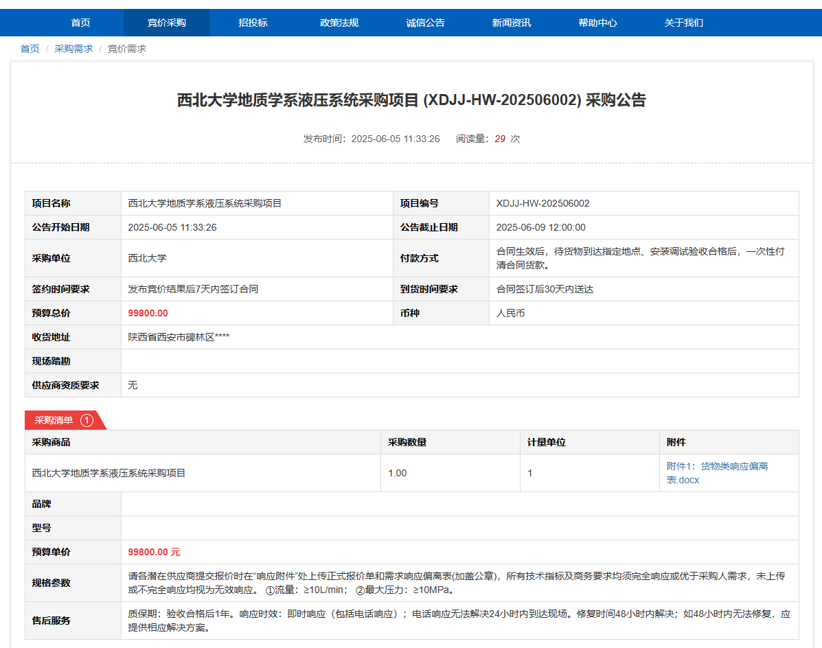 伟德国际1946源于英国地质学系液压系统采购项目(XDJJ-HW-202506002)竞价采购公告 作者: 编辑: 时间:2025-06-05 原公告链接:https://www.ejingcai.com.cn/site/bidding/detail/18680