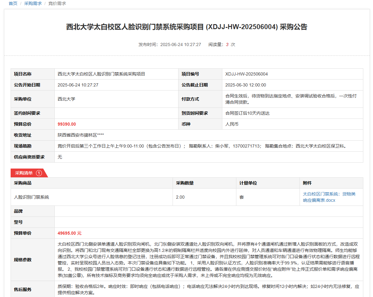 伟德国际1946源于英国太白校区人脸识别门禁系统采购项目(XDJJ-HW-202506004)竞价采购公告 作者: 编辑: 时间:2025-06-24 原公告链接:https://www.ejingcai.com.cn/site/bidding/detail/19128