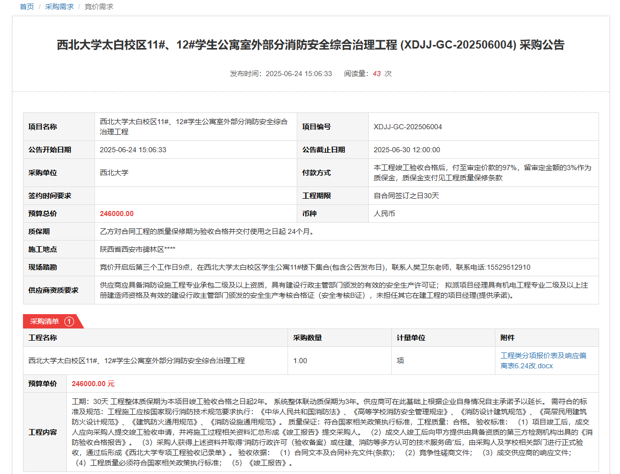 伟德国际1946源于英国太白校区11#、12#学生公寓室外部分消防安全综合治理工程(XDJJ-GC-202506004)竞价采购公告 作者:采购与招标办公室 编辑: 时间:2025-06-25 原公告链接:https://www.ejingcai.com.cn/site/bidding/detail/19136