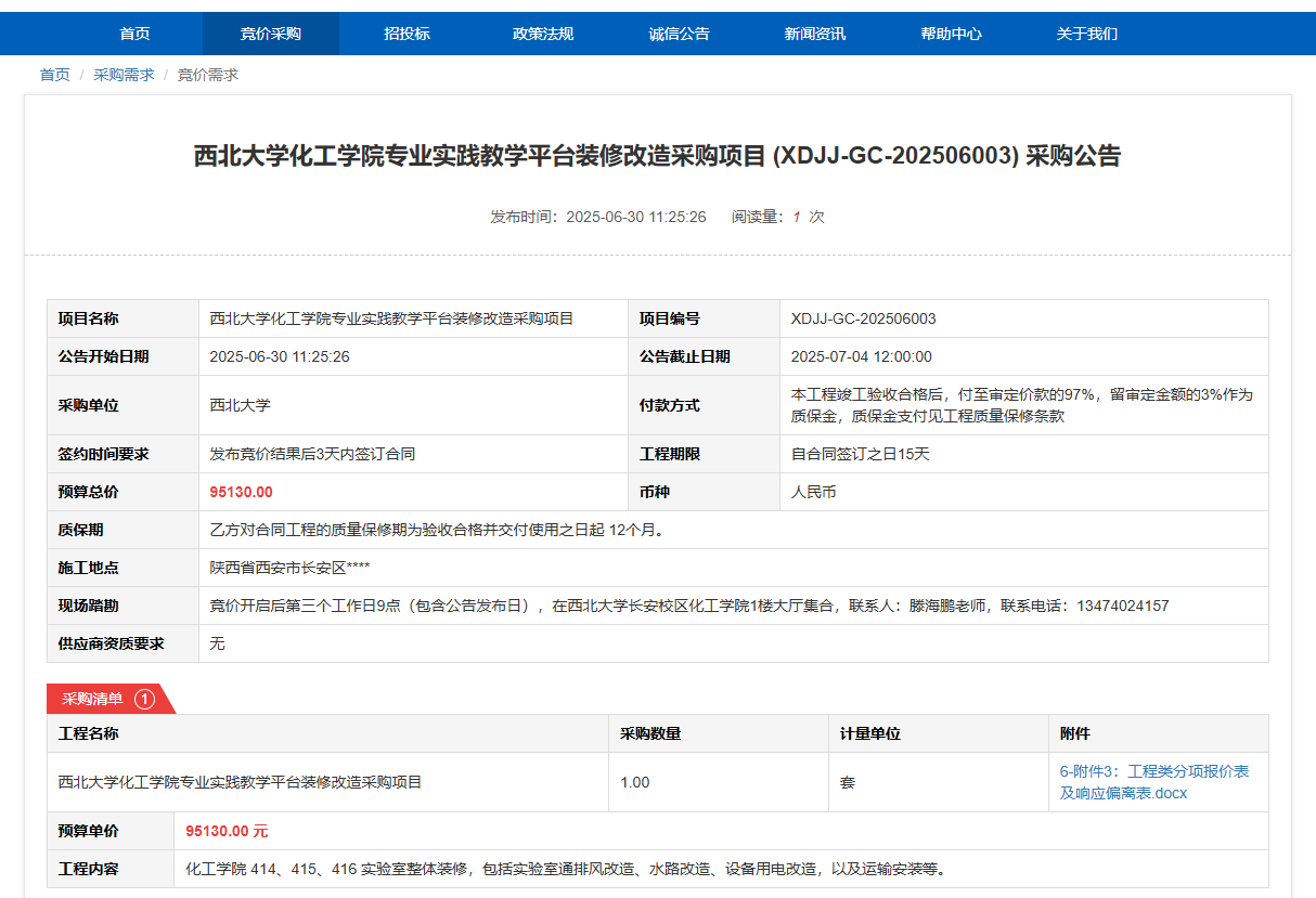 伟德国际1946源于英国化工学院专业实践教学平台装修改造采购项目(XDJJ-GC-202506003)竞价采购公告 作者:采购与招标办公室 编辑: 时间:2025-06-30 原公告链接:https://www.ejingcai.com.cn/site/bidding/detail/19244
