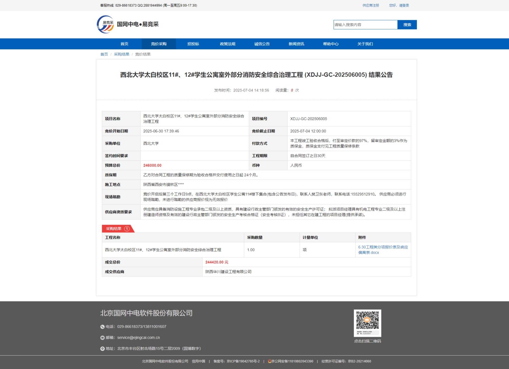 伟德国际1946源于英国太白校区11#、12#学生公寓室外部分消防安全综合治理工程 (XDJJ-GC-202506005) 结果公告 作者: 编辑:采购与招标办公室 时间:2025-07-04 原公告链接:https://www.ejingcai.com.cn/site/bidding/detail/19344