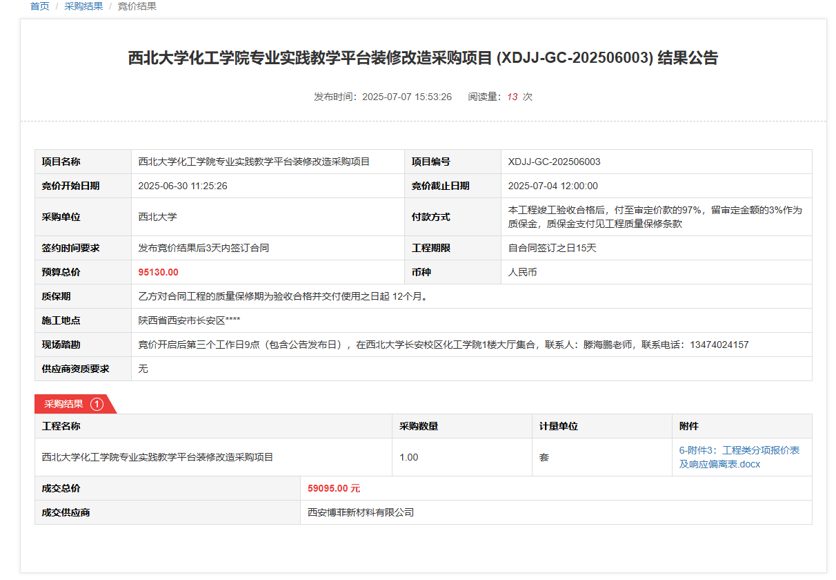 伟德国际1946源于英国化工学院专业实践教学平台装修改造采购项目(XDJJ-GC-202506003)竞价结果公告