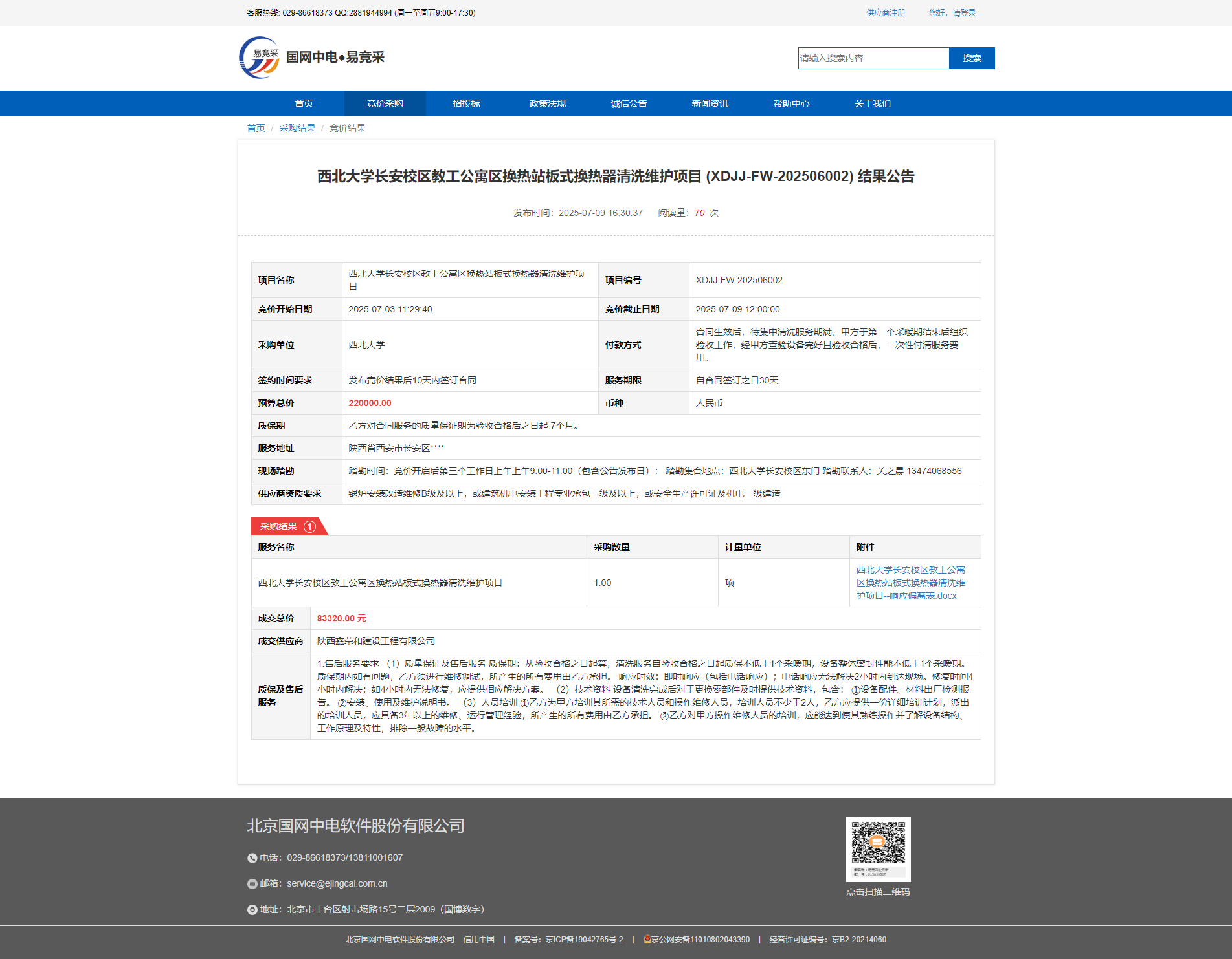 伟德国际1946源于英国长安校区教工公寓区换热站板式换热器清洗维护项目 (XDJJ-FW-202506002) 结果公告