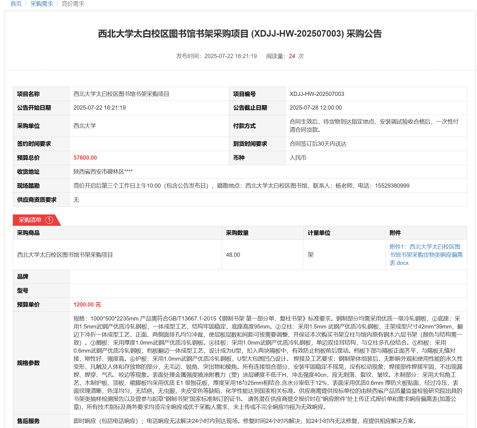 伟德国际1946源于英国太白校区图书馆书架采购项目(XDJJ-HW-202507003)竞价采购公告 作者:采购与招标办公室 编辑: 时间:2025-07-22 原公告链接:https://www.ejingcai.com.cn/site/bidding/detail/19666