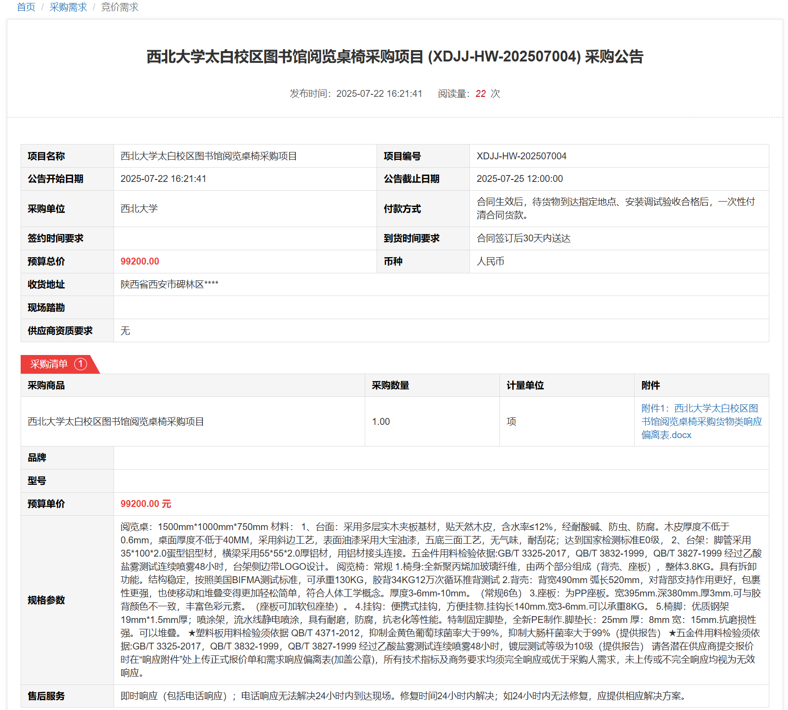 伟德国际1946源于英国太白校区图书馆阅览桌椅采购项目(XDJJ-HW-202507004)竞价采购公告 作者:采购与招标办公室 编辑: 时间:2025-07-22 原公告链接:https://www.ejingcai.com.cn/site/bidding/detail/19667