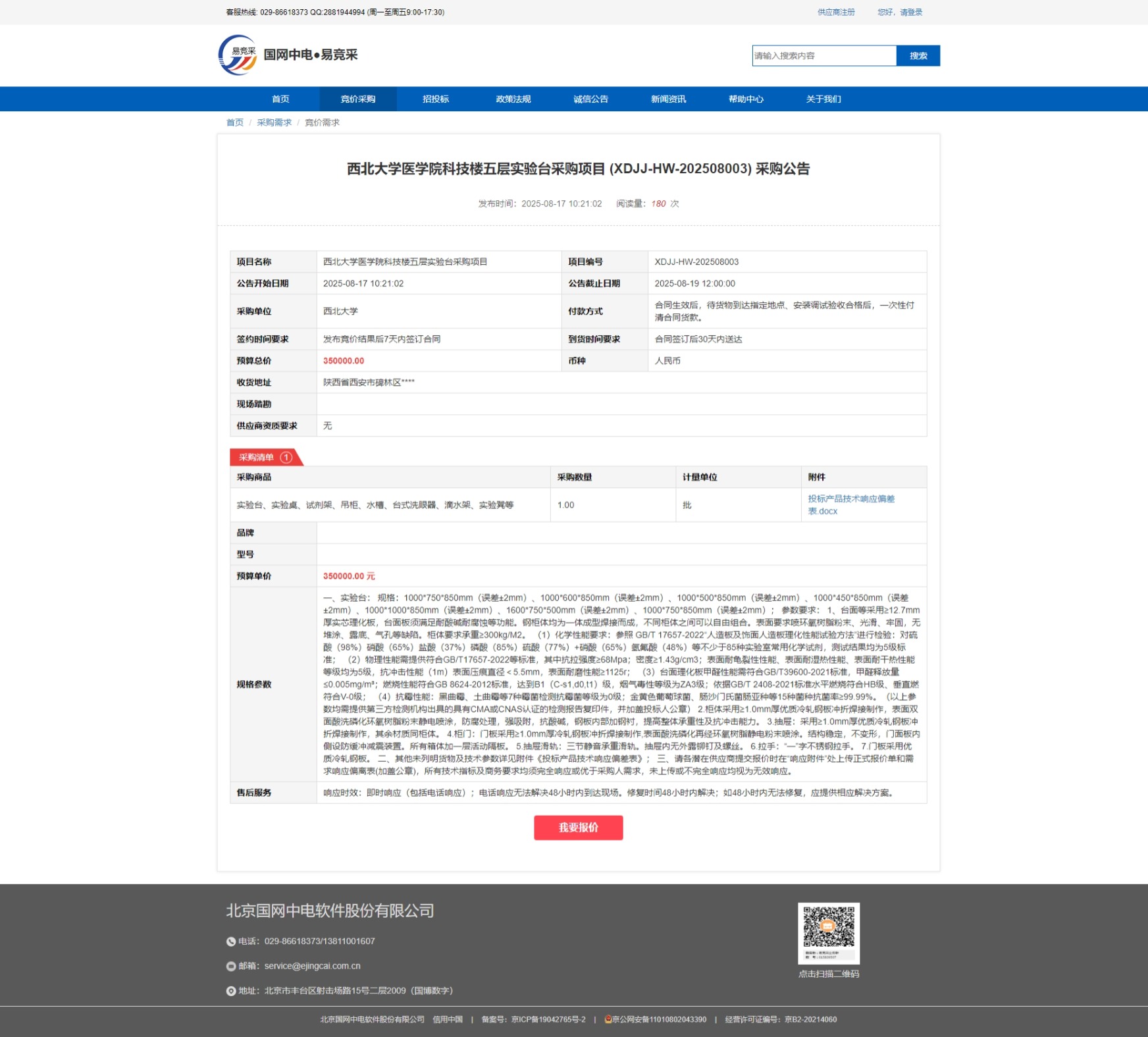 伟德国际1946源于英国医学院科技楼五层实验台采购项目 (XDJJ-HW-202508003)竞价 采购公告 作者: 编辑:采购与招标办公室 时间:2025-08-18 原公告链接:https://www.ejingcai.com.cn/site/bidding/detail/19996