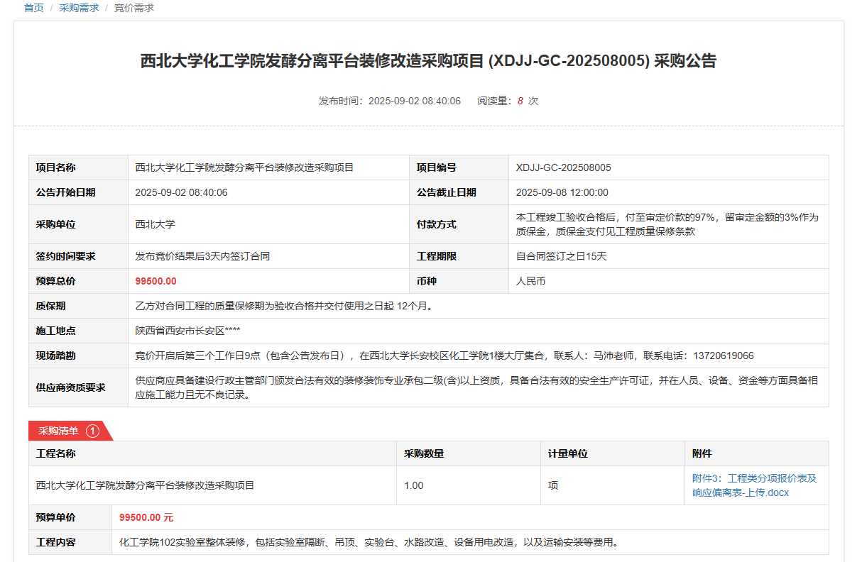 伟德国际1946源于英国化工学院发酵分离平台装修改造采购项目(XDJJ-GC-202508005)竞价采购公告