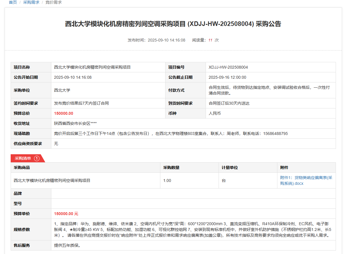 伟德国际1946源于英国模块化机房精密列间空调采购项目(XDJJ-HW-202508004)竞价采购公告