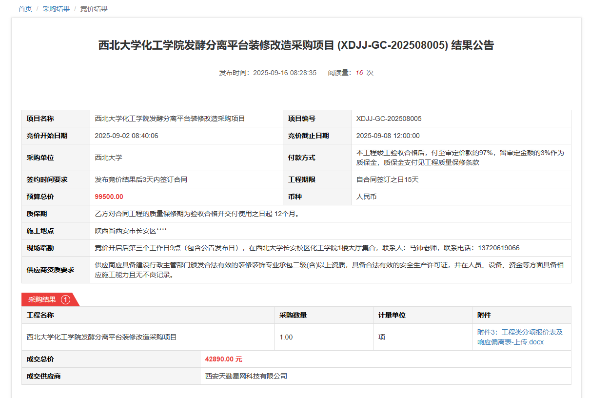 伟德国际1946源于英国化工学院发酵分离平台装修改造采购项目(XDJJ-GC-202508005)竞价结果公告