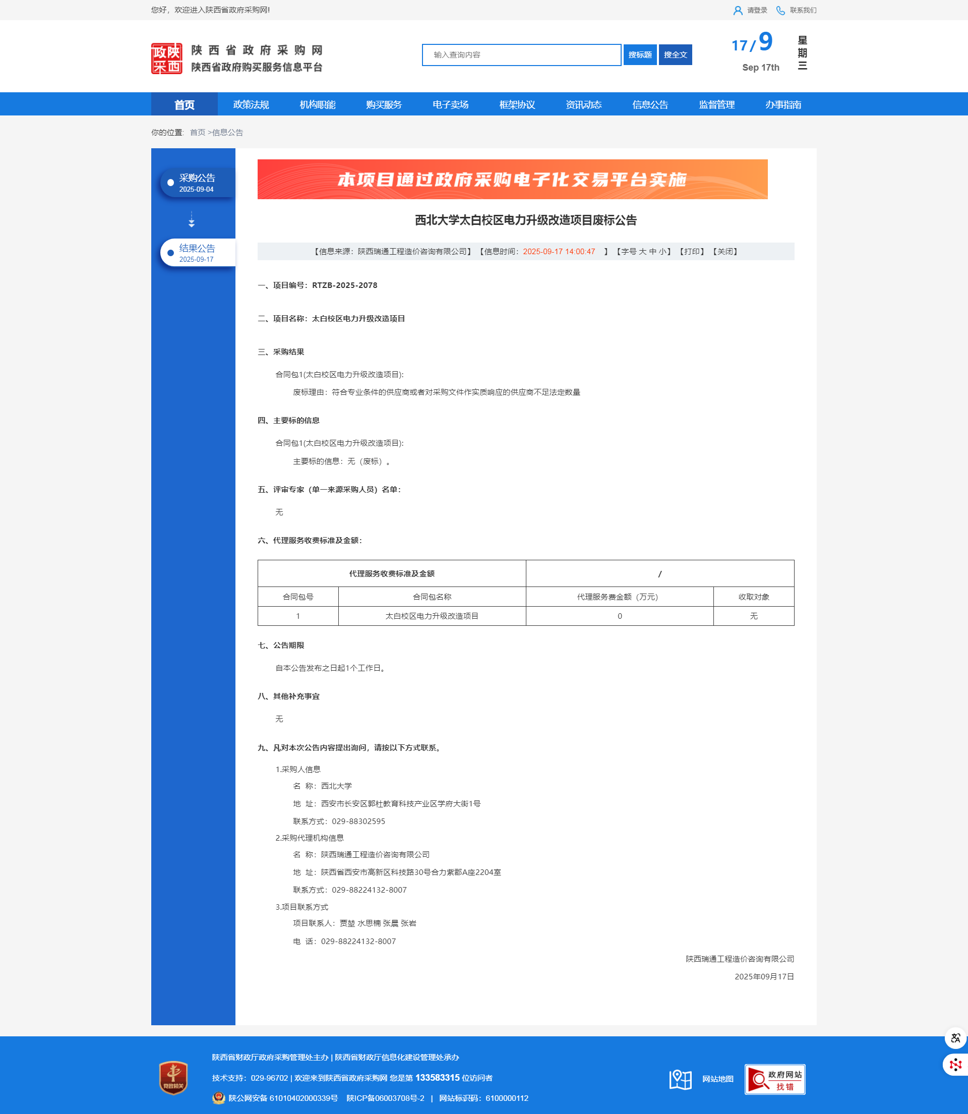 伟德国际1946源于英国太白校区电力升级改造项目废标公告