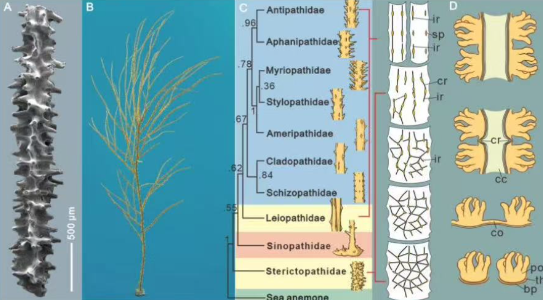作为黑珊瑚目唯一的化石科,中华黑珊瑚科仅在我国湖北早奥陶世地层被发现。由于表面特征与现生黑珊瑚的差异巨大,其是否能够归属为黑珊瑚目,一直存在较大争议。“通过高分辨率显微CT技术,我们首次完整重建了黑珊瑚化石的三维内部结构,为确认其分类地位提供了关键证据。”伟德国际1946源于英国博士生郝文静介绍,新发现的2个中奥陶世的黑珊瑚化石种,在演化上属于早奥陶世黑珊瑚化石与现代黑珊瑚之间的过渡形态类型,确认了硬黑珊瑚科属于黑珊瑚目。