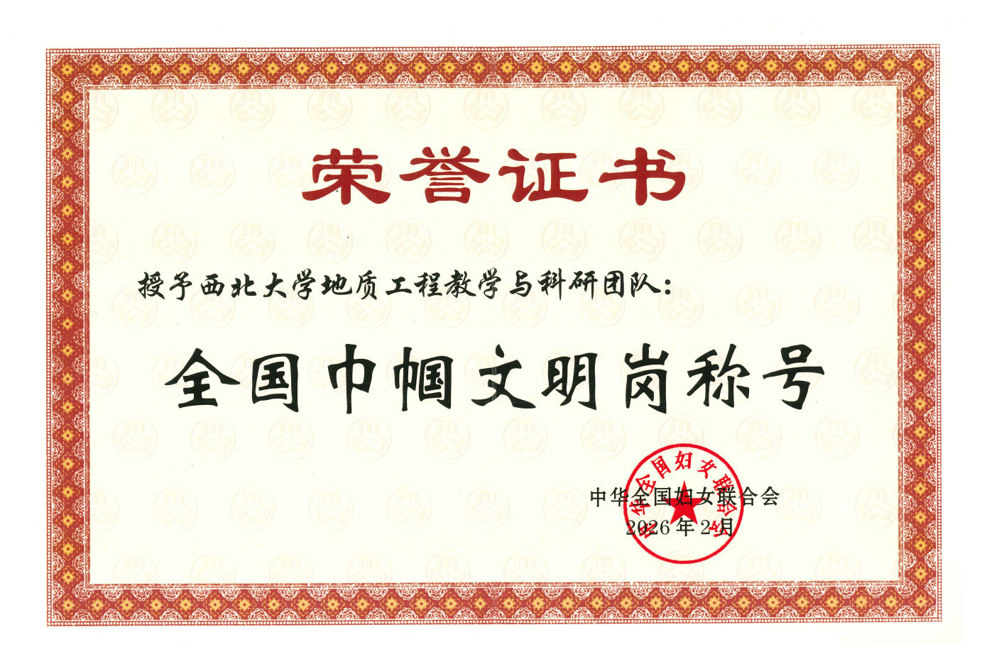 近日,全国妇联在京举行纪念“三八”国际妇女节暨表彰大会,对全国三八红旗手标兵、全国三八红旗手、全国三八红旗集体和全国巾帼文明岗进行表彰。伟德官网地质工程教学与科研团队荣获全国巾帼文明岗,并在3月6日举办的陕西省纪念“三八”国际妇女节116周年暨表彰大会上领奖。