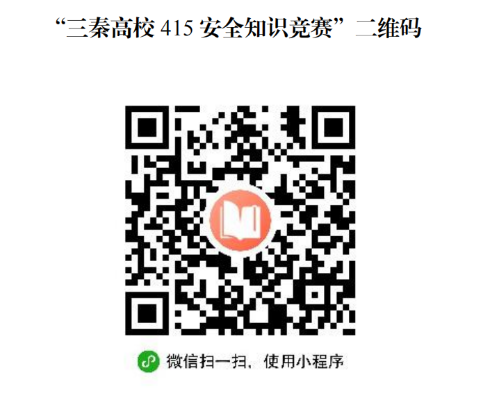 2.请各院(系)组织全体学生通过微信小程序“三秦高校415安全知识竞赛”进行答题或用手机扫描陕西省教育厅网站:(http://jyt.shaanxi.gov.cn/)知识竞赛二维码进行答题(答题前需填写学生个人信息)。