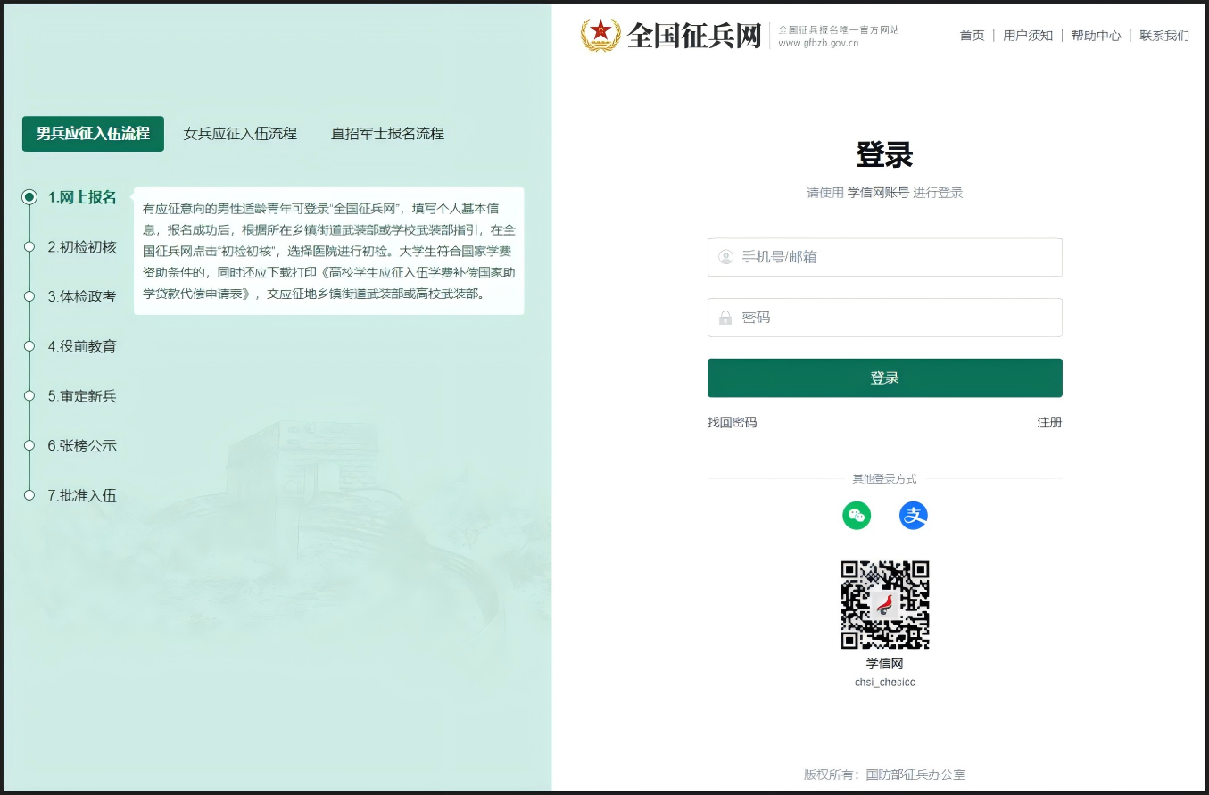 注意:①注册学信网账号必须实名,一定要认真填写真实姓名和身份证,兵役机关将对信息进行审核。注册时使用的手机号即是账号,请牢记账号和密码。
