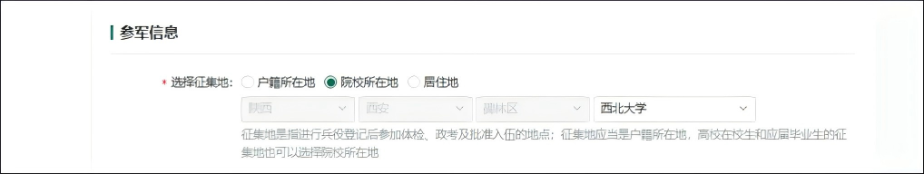 点击“开始兵役登记”按钮后,进入兵役登记信息填写页面,填写户籍所在地等信息,点击提交后即完成兵役登记。