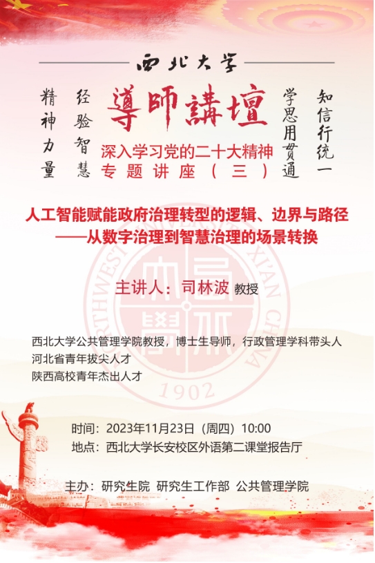 导师讲坛“深入学习党的二十大精神”专题讲座(三):人工智能赋能政府治理转型的逻辑、边界与路径——从数字治理到智慧治理的场景转变