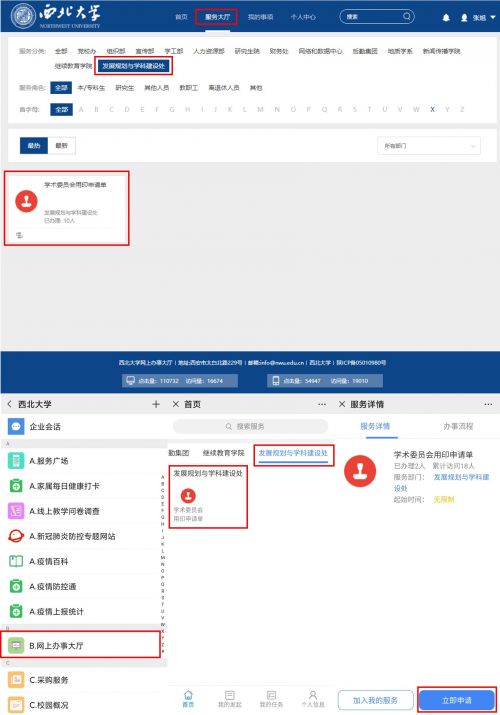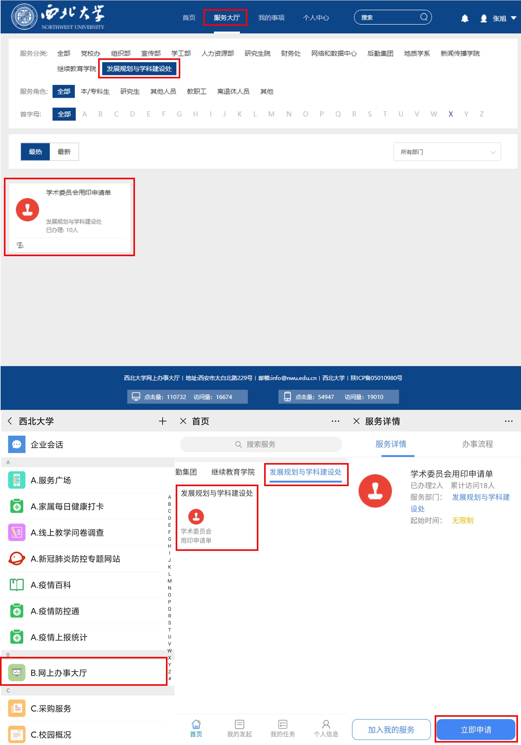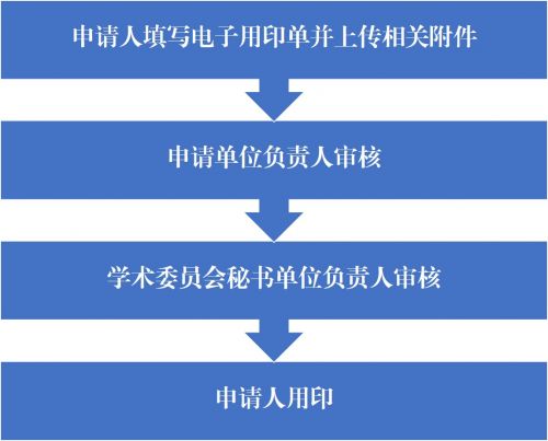 校内人员办理用印审批手续,可通过学校官网或伟德国际1946源于英国微信企业号登录“网上办事大厅”,在“发展规划与学科建设处”页面内选取“学术委员会用印申请单”服务模块,填报电子表单内的审批事项,同时上传用印材料清单。提交成功后可查看具体项目运转流程和处理记录。线上审批完成后,工作人员将及时与您电话联系预约盖印时间。