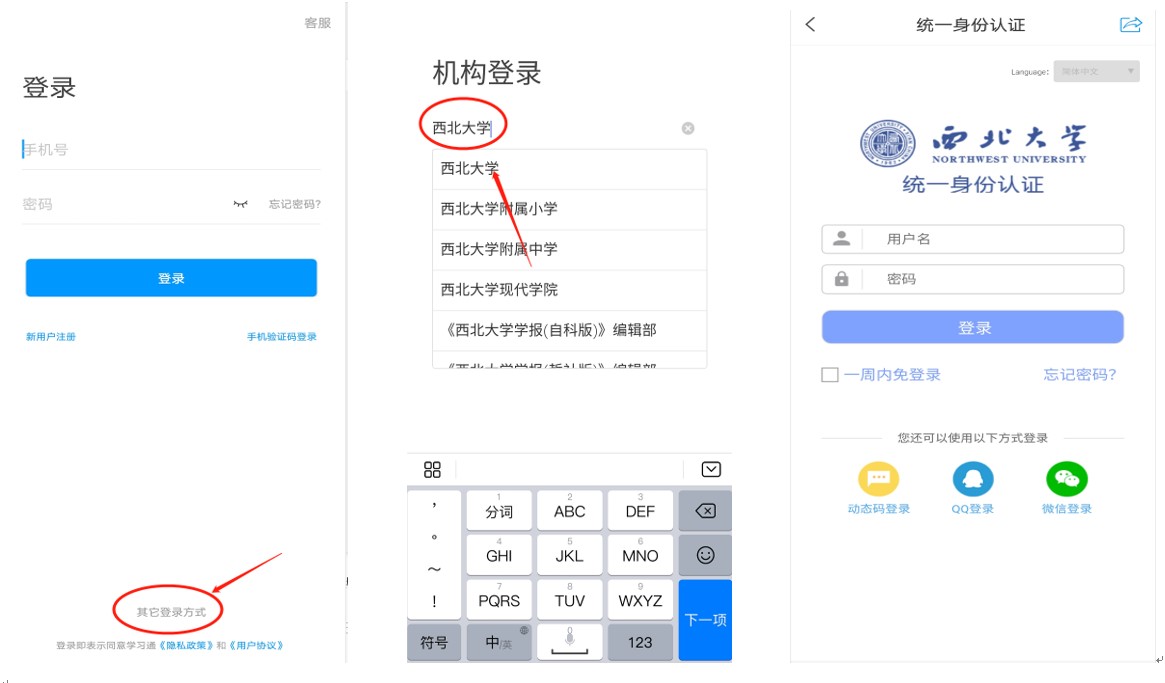 5.下载过后,进入登录页面——“其它登录方式”——单位栏输入“伟德国际1946源于英国”——跳转到学校统一身份认证登录。