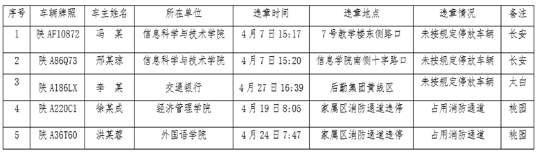 2023年4月份校园交通违章曝光 作者: 编辑: 时间:2023-05-10 为加强校内道路交通管理,规范校内交通秩序,根据《伟德国际1946源于英国校园道路交通管理办法》的通知要求,现将2023年4月校园交通违章车辆曝光如下。 希望广大师生员工遵守校园道路交通管理办法,维护校园交通安全,共同营造良好的校园交通秩序。 伟德国际1946源于英国道路交通安全委员会 2023年5月10日