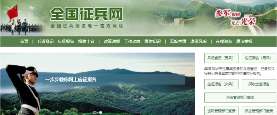 登录全国征兵网点击“应征报名(男兵)”进入页面男兵在应征报名之前要先完成兵役登记点击“兵役登记(男兵)”进入操作页面。