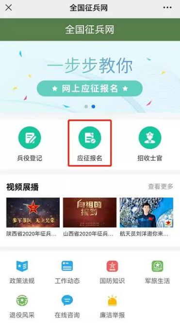 方式二:关注“陕西征兵”公众号,点击菜单栏“应征报名”直通报名页面。
