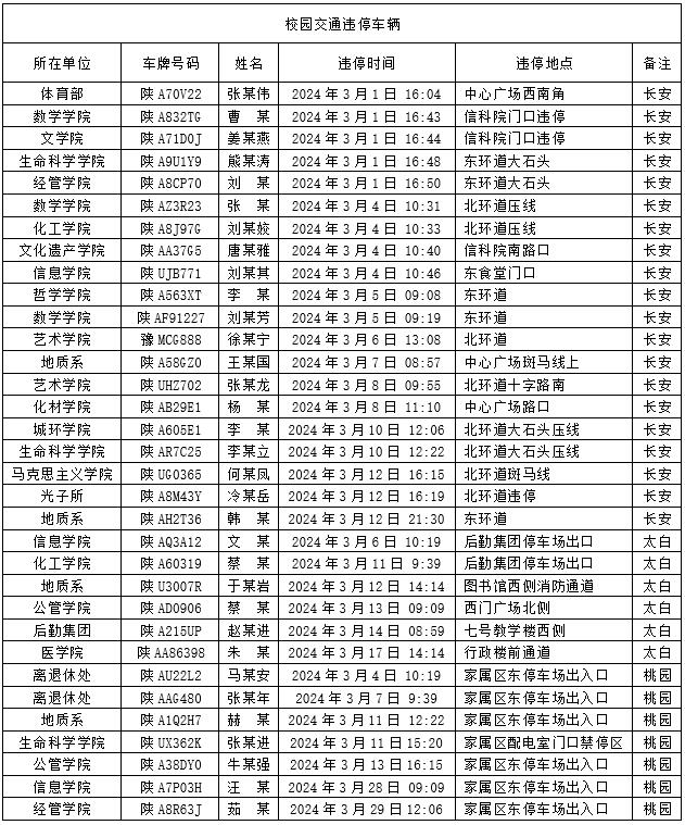 为加强校内道路交通安全管理,规范校内交通秩序,根据《伟德国际1946源于英国校园道路交通管理办法》有关要求,现将2024年3月校园交通违章车辆予以曝光,所在单位负责对本单位违章师生员工进行交通安全教育和日常管理。
