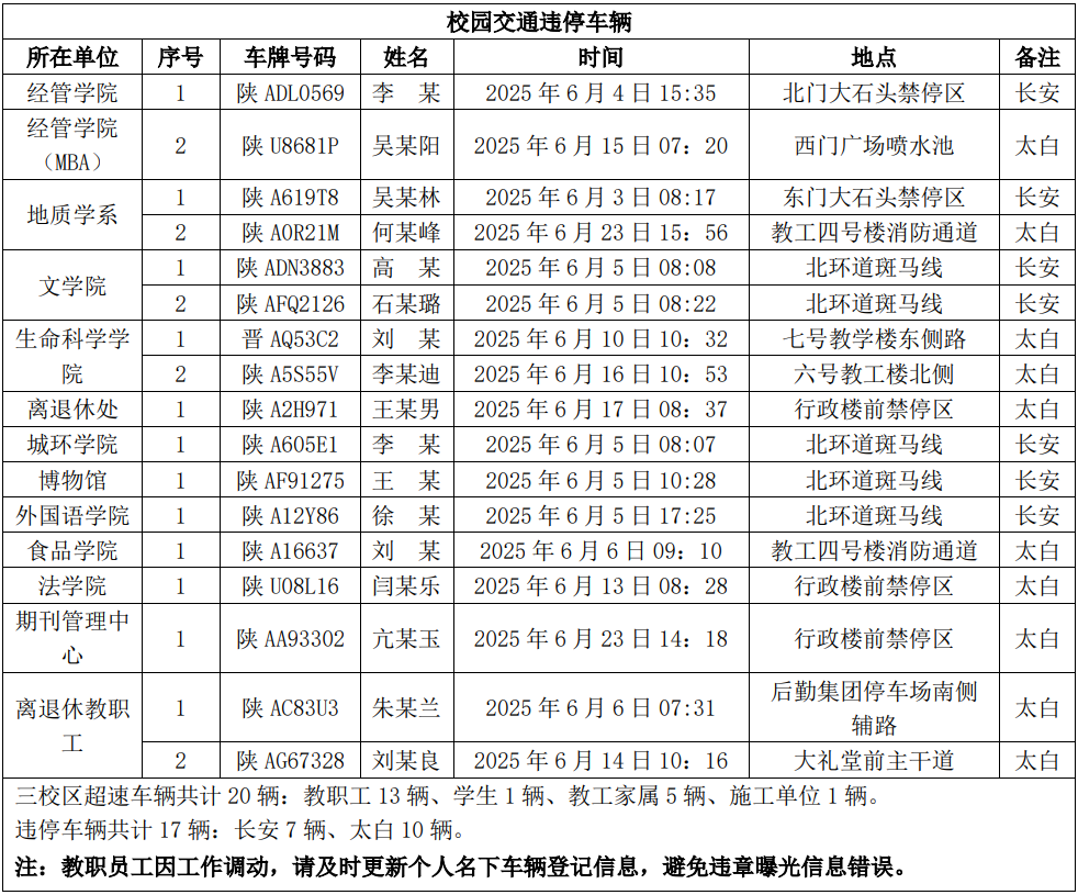 为进一步加强校园交通管理,保障校园交通安全有序,维护学校正常的教学、科研和生活秩序,切实保护师生员工的人身财产安全,根据《伟德国际1946源于英国校园交通安全管理规定》的相关要求,现将2025年6月校园交通违章车辆予以曝光,具体要求与违章信息如下: