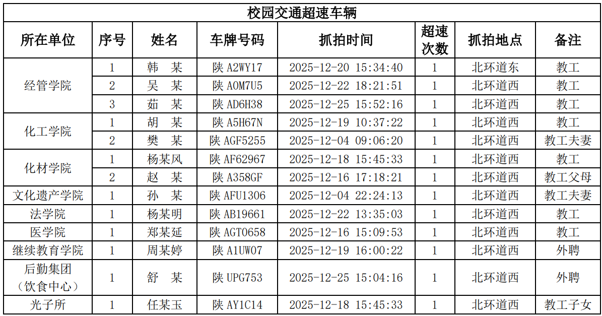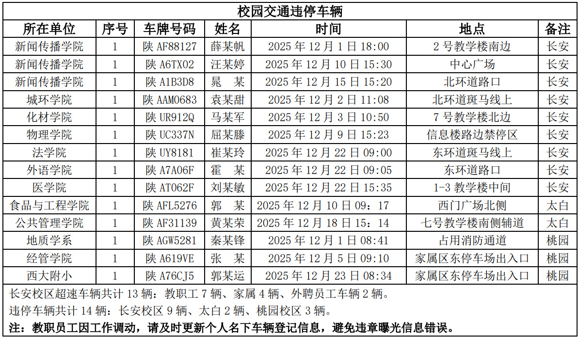 为进一步加强校园交通管理,保障校园交通安全有序,维护学校正常的教学、科研和生活秩序,切实保护师生员工的人身财产安全,根据《伟德国际1946源于英国校园交通安全管理规定》的相关要求,现将2025年12月校园交通违章车辆予以曝光,具体要求与违章信息如下: