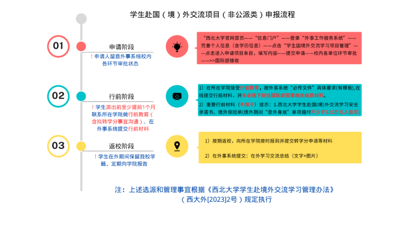 3. 申请学生在确定录取后,应及时履行出国(境)前相关行前手续。请务必了解有关本项目学生的申请、行前、返校阶段情况说明,请见附件 申报流程说明或下图。