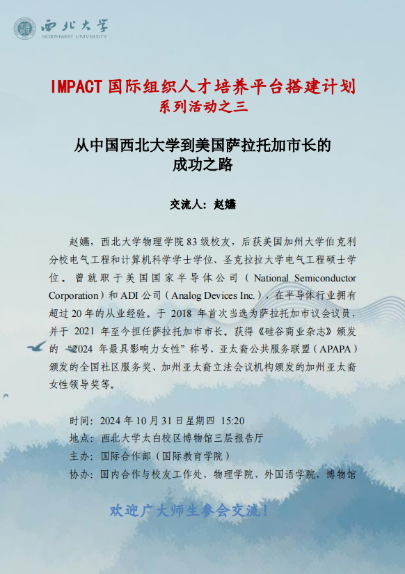 IMPACT国际组织人才培养平台搭建计划系列活动之三:从中国伟德国际1946源于英国到美国萨拉托加市长的成功之路 作者: 编辑:张兆慧 时间:2024-10-28 (撰稿人:国际部出国办 发布人:张兆慧 审核人:任惠莲)