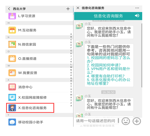 第二步:在“伟德国际1946源于英国”微信企业号中点击“X.信息化咨询服务”,信息化智能客服小玉将为您解答信息化服务问题。