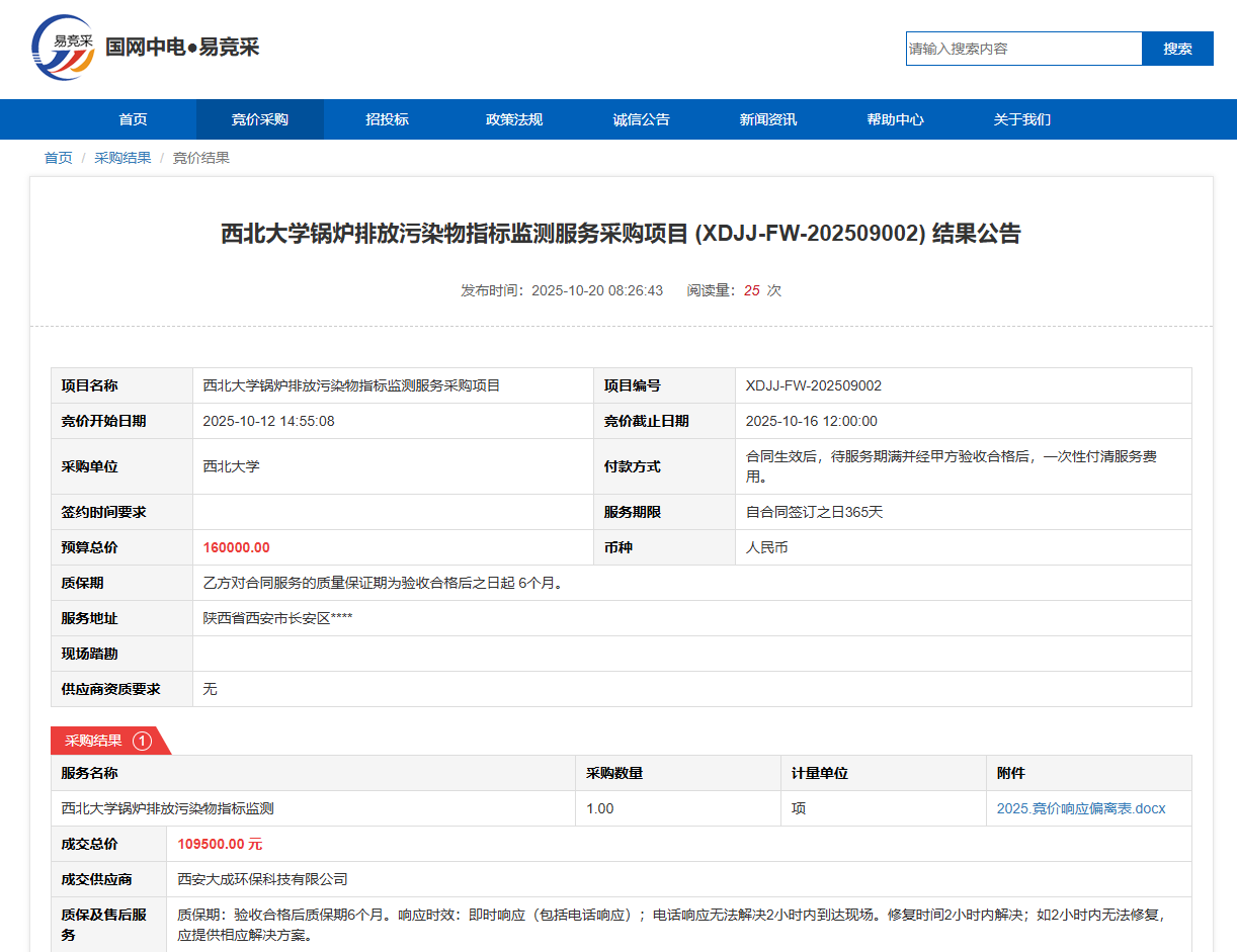 伟德国际1946源于英国锅炉排放污染物指标监测服务采购项目(XDJJ-FW-202509002)竞价结果公告