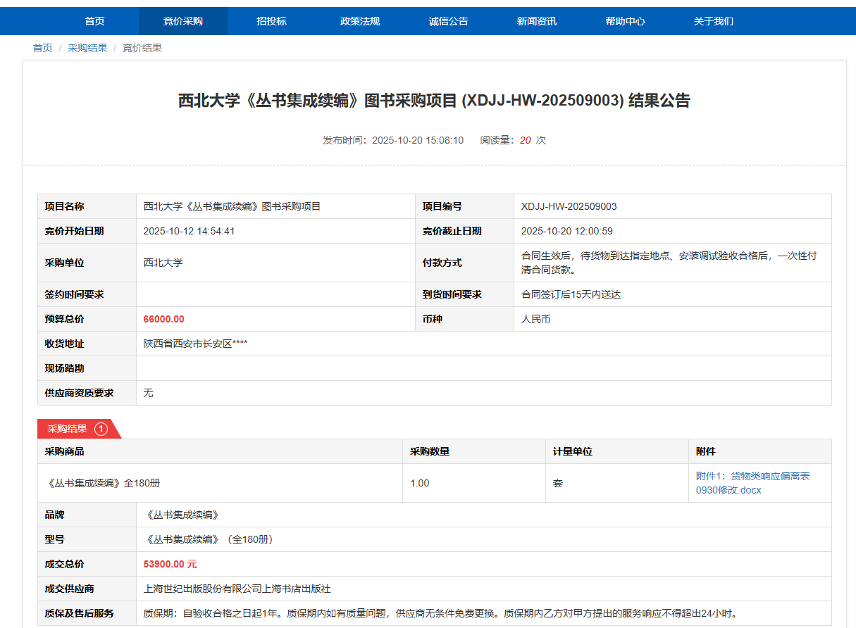 伟德国际1946源于英国《丛书集成续编》图书采购项目(XDJJ-HW-202509003)竞价结果公告