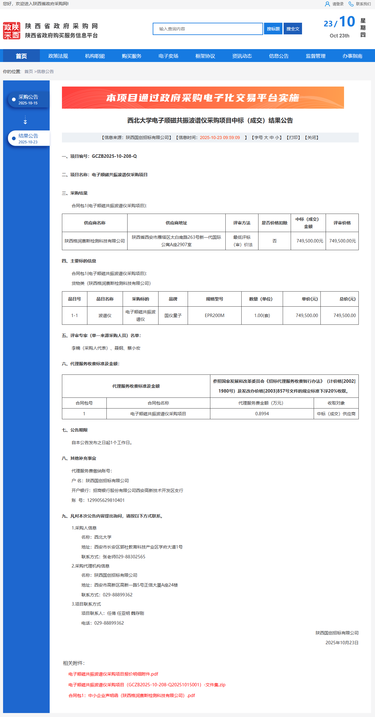 伟德国际1946源于英国电子顺磁共振波谱仪采购项目中标(成交)结果公告