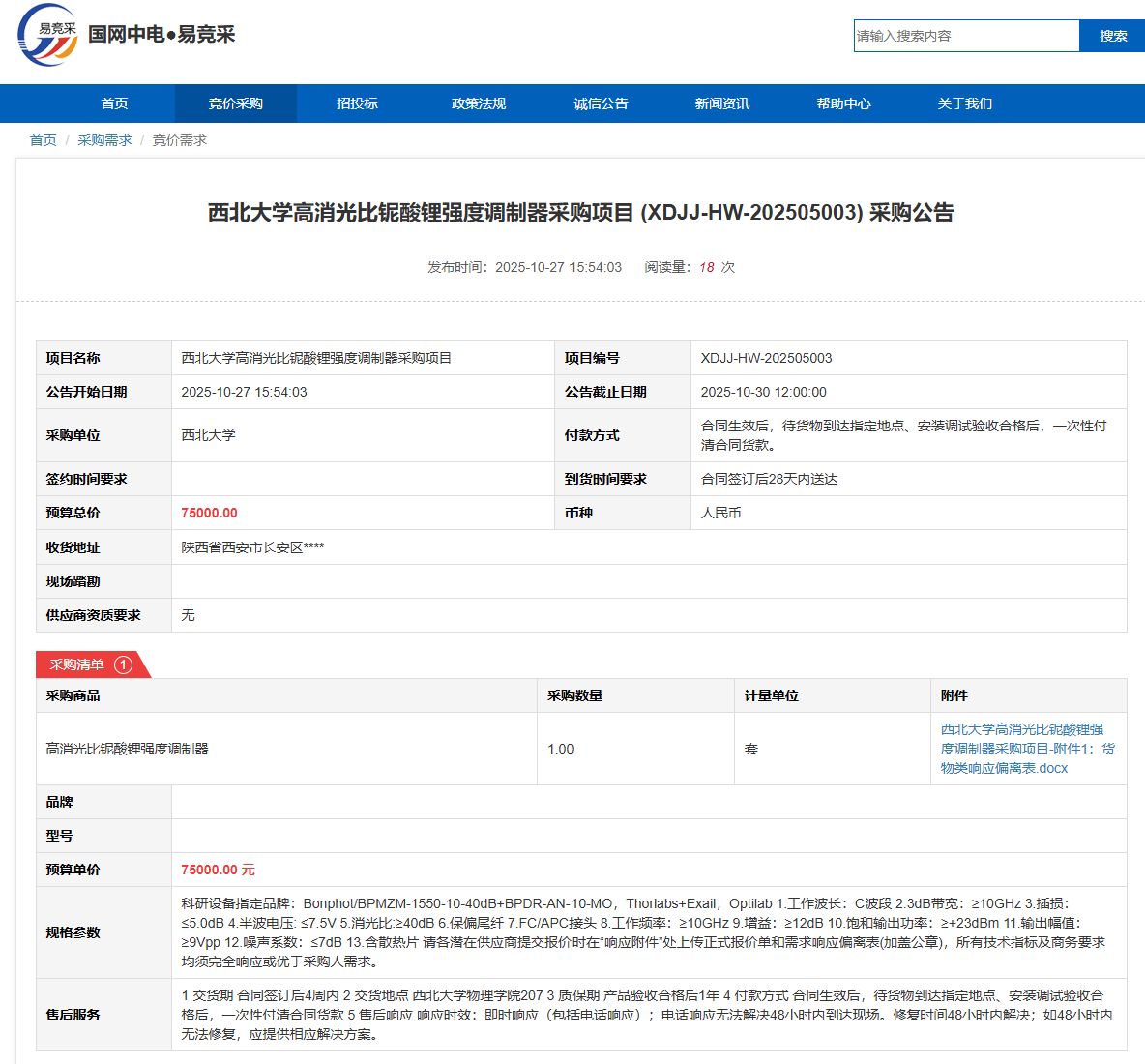 伟德国际1946源于英国高消光比铌酸锂强度调制器采购项目(XDJJ-HW-202505003)竞价采购公告