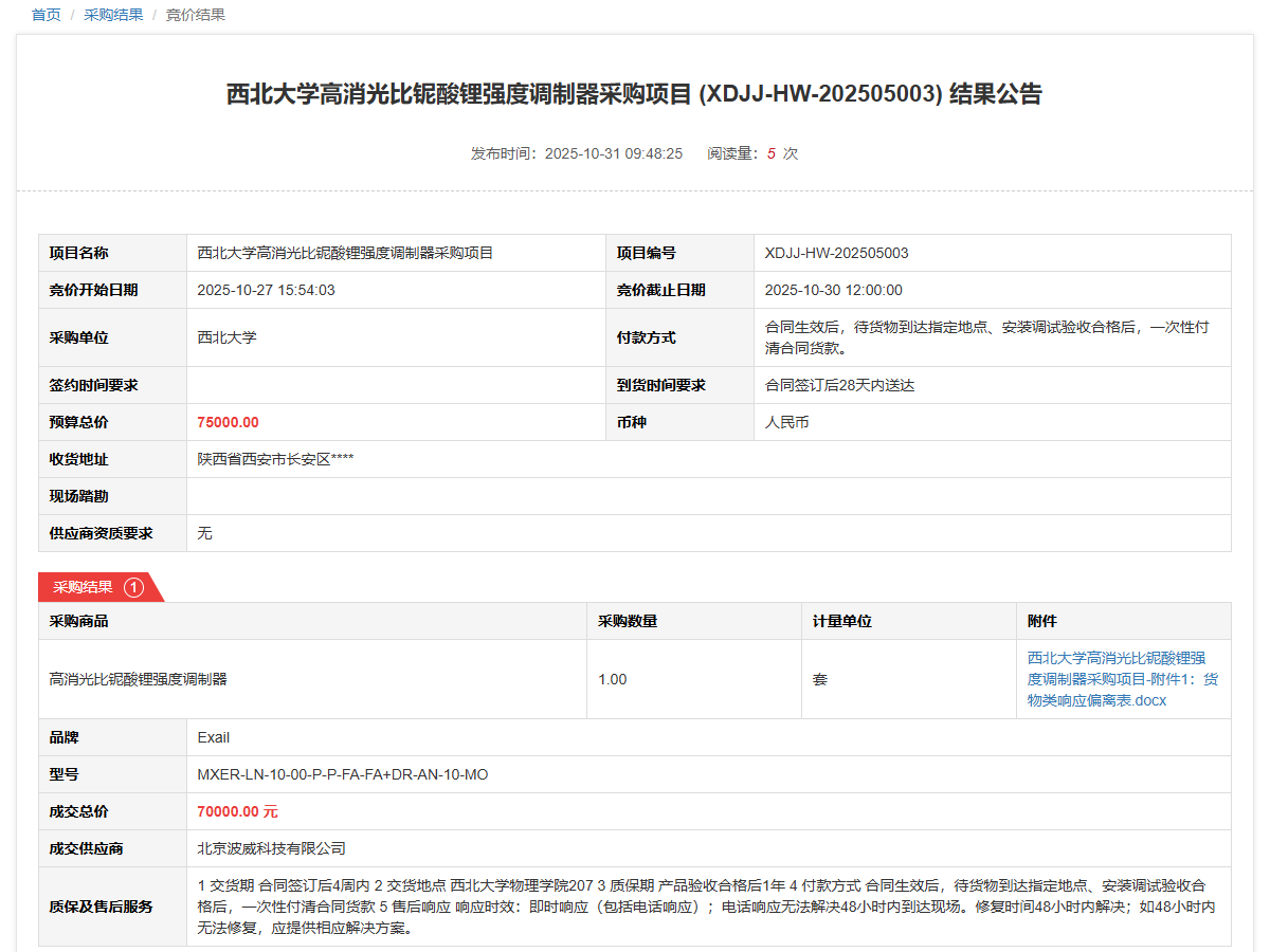 伟德国际1946源于英国高消光比铌酸锂强度调制器采购项目(XDJJ-HW-202505003)竞价结果公告