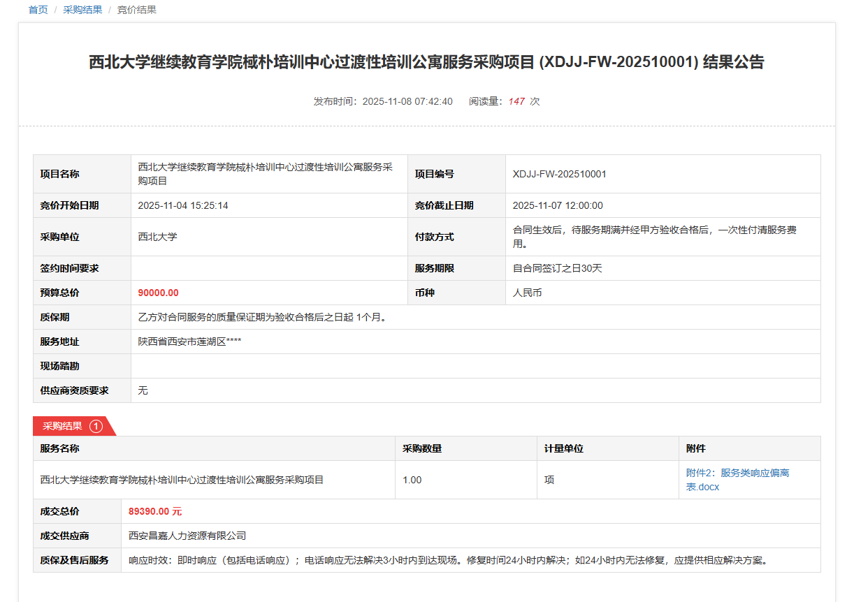 伟德国际1946源于英国继续教育学院棫朴培训中心过渡性培训公寓服务采购项目(XDJJ-FW-202510001)竞价结果公告