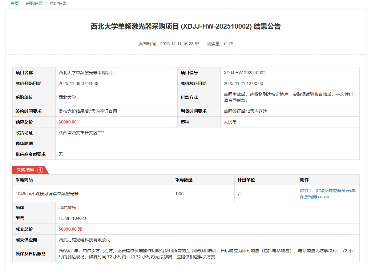 伟德国际1946源于英国单频激光器采购项目(XDJJ-HW-202510002)竞价结果公告