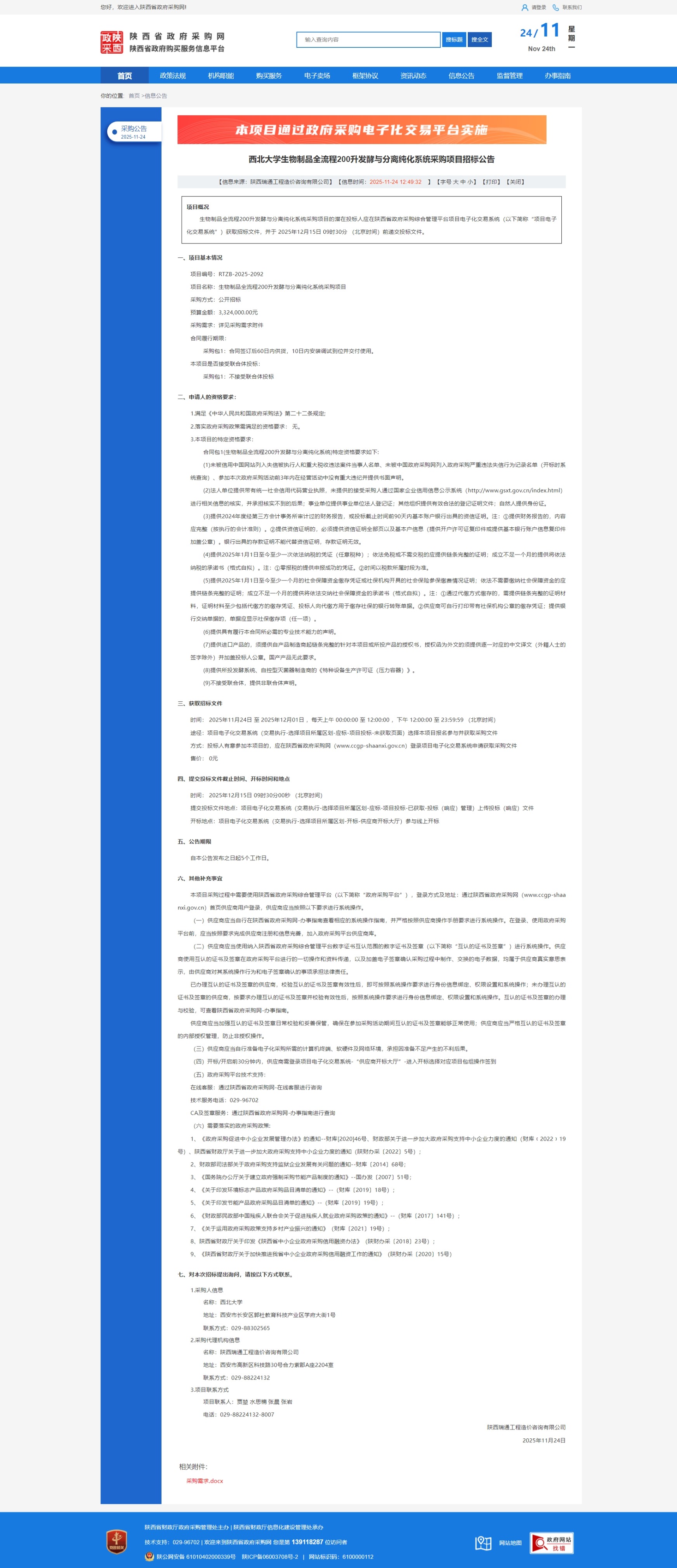 伟德国际1946源于英国生物制品全流程200升发酵与分离纯化系统采购项目招标公告 作者: 编辑:国有资产管理处 时间:2025-11-24 原公告链接:https://www.ccgp-shaanxi.gov.cn/freecms/site/shaanxi/ggxx/info/2025/8a69c6d09a636c6c019ab41e3479334d.html?noticeType=001011¬iceId=34afdb62-c8f3-11f0-8063-08c0eb20c666