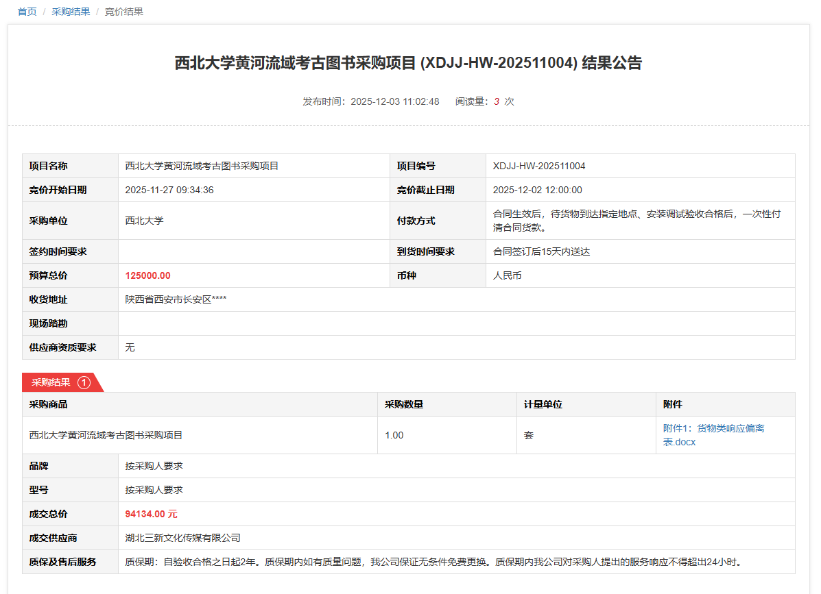 伟德国际1946源于英国黄河流域考古图书采购项目(XDJJ-HW-202511004)竞价结果公告