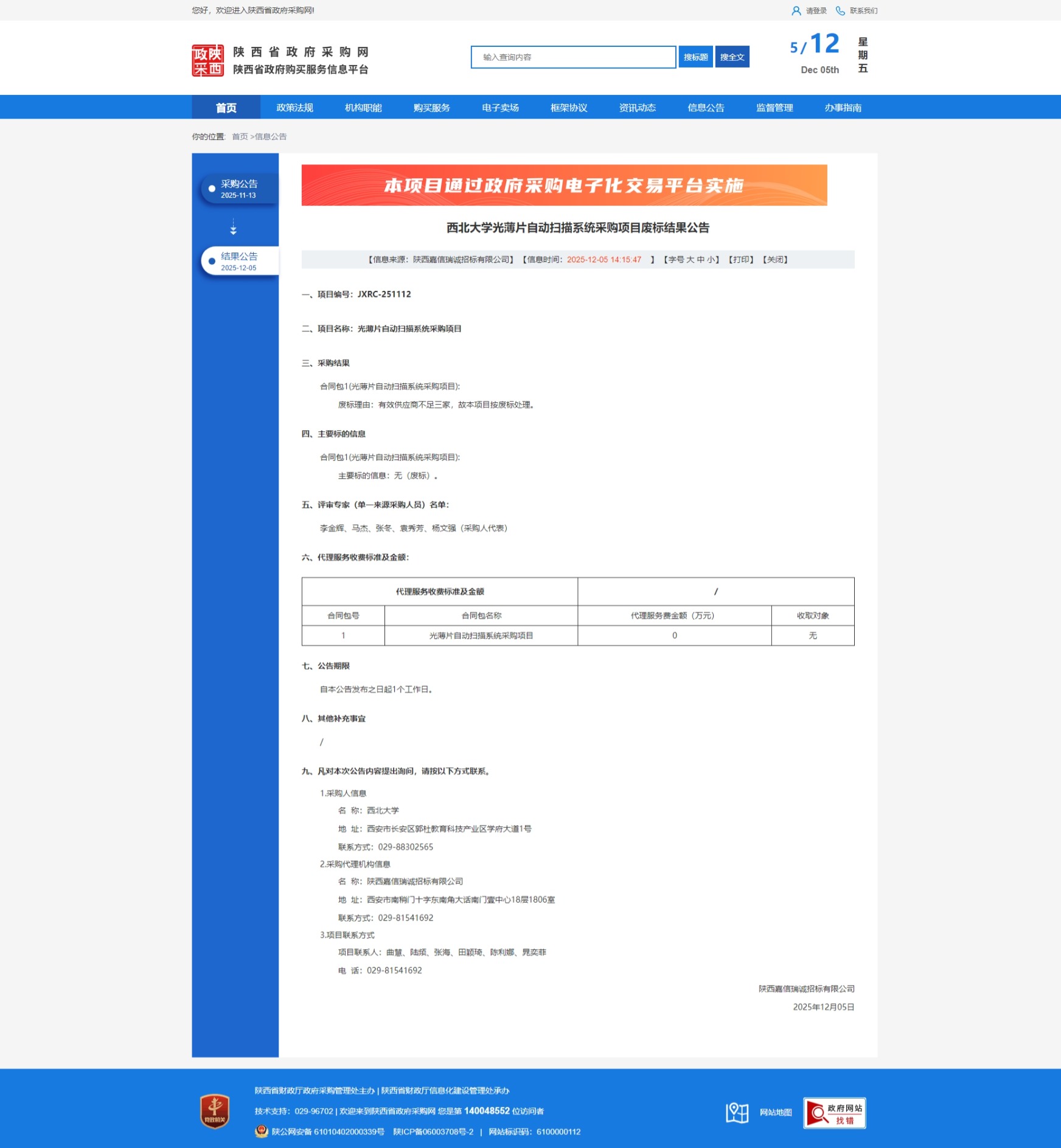 伟德国际1946源于英国光薄片自动扫描系统采购项目废标结果公告 作者: 编辑:国有资产管理处 时间:2025-12-05 原公告链接:https://www.ccgp-shaanxi.gov.cn/freecms/site/shaanxi/ggxx/info/2025/8a69c5539a636e42019aed20e78944bd.html?noticeType=001006¬iceId=18f9e944-d1a4-11f0-8063-08c0eb20c666
