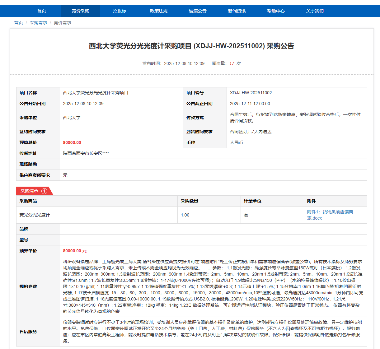 伟德国际1946源于英国荧光分光光度计采购项目(XDJJ-HW-202511002)竞价采购公告